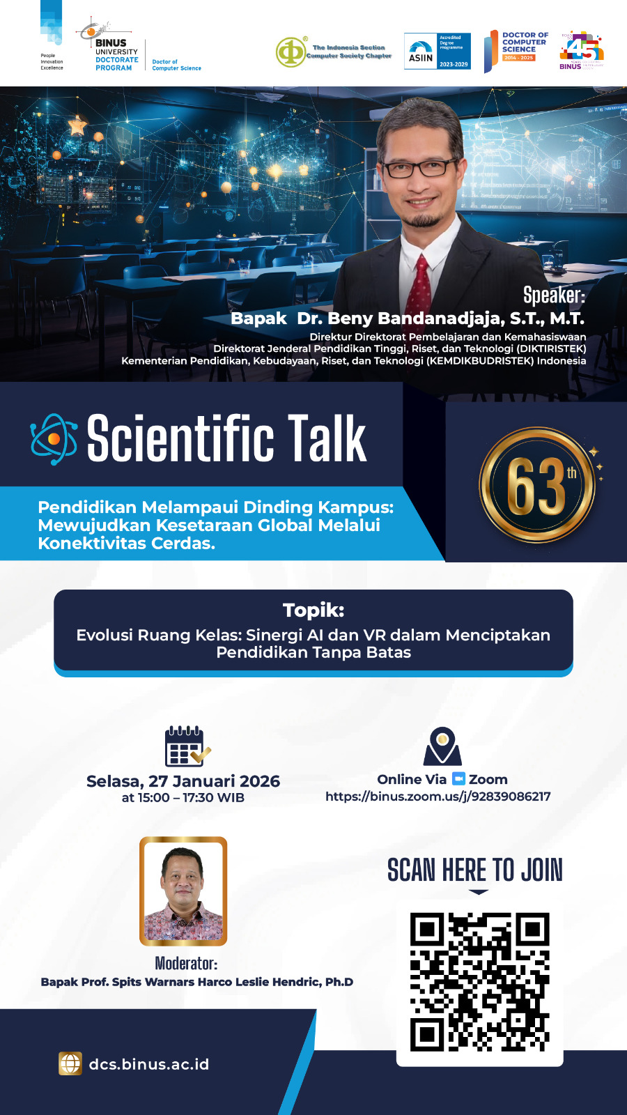 Program Doktor Ilmu Komputer BINUS University kembali menyelenggarakan Scientific Talk ke-63 dengan mengangkat tema “Pendidikan Melampaui Dinding Kampus: Mewujudkan Kesetaraan Global Melalui Konektivitas Cerdas.” Kegiatan ini menjadi wadah diskusi ilmiah untuk membahas transformasi pendidikan di era digital, khususnya melalui pemanfaatan teknologi Artificial Intelligence (AI) dan Virtual Reality (VR).