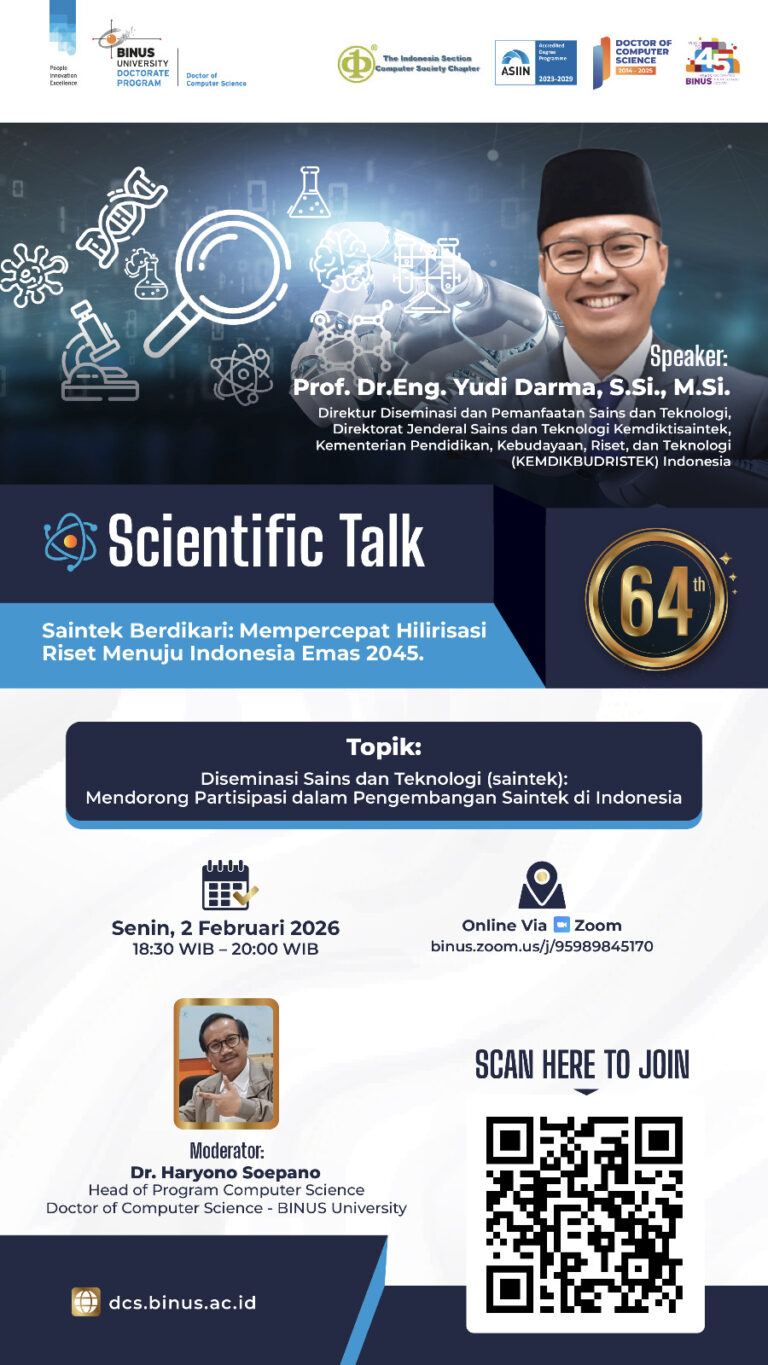 Scientific Talk ini akan dilaksanakan secara daring melalui Zoom pada Senin, 2 Februari 2026, pukul 18.30–20.00 WIB, dan dimoderatori oleh Dr. Haryono Soepano, Head of Program Computer Science, Doctor of Computer Science BINUS University. Kegiatan ini terbuka bagi sivitas akademika dan masyarakat umum yang memiliki ketertarikan pada pengembangan riset, inovasi, dan kebijakan sains dan teknologi.